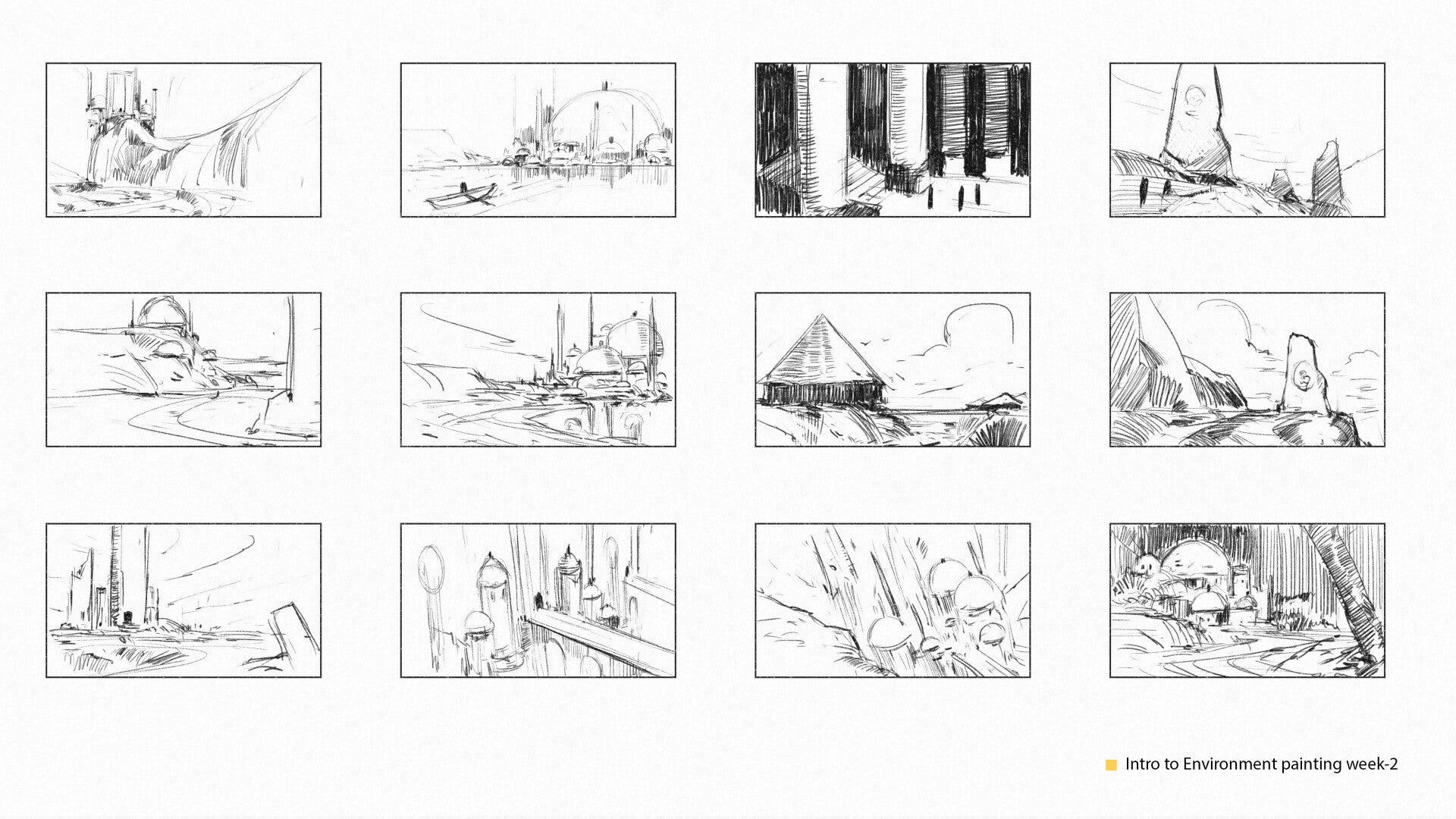 • Weather and lighting reference sketches: day, night, rain, fog, shadows.